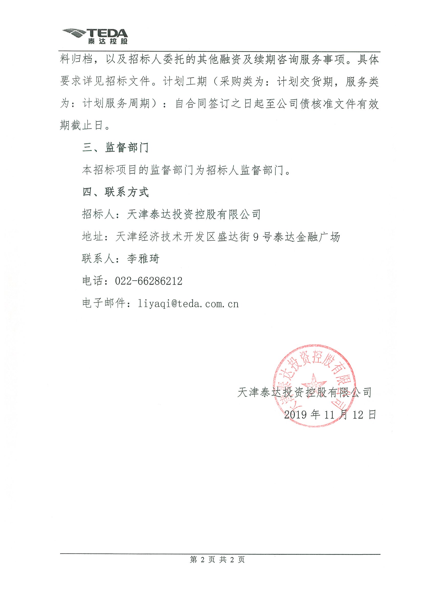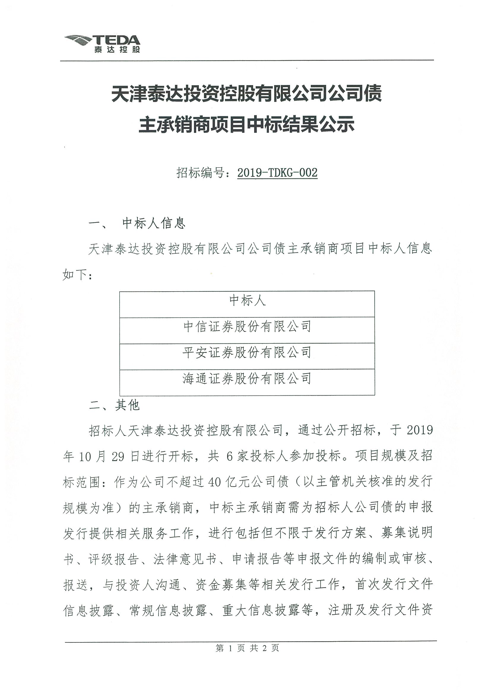 天津泰达投资控股有限公司公司债主承销商项目中标结果公示